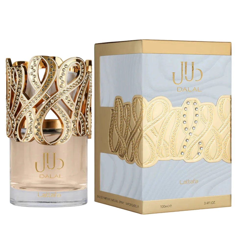 Sweet, elegant, and irresistibly feminine, Lattafa Dalal Eau de Parfum by Lattafa Perfumes is a beautiful floral-fruity gourmand fragrance that blends juicy fruits, delicate florals, and warm vanilla for a comforting and sophisticated scent. It opens with a fresh burst of apple and mandarin, followed by soft white florals that add a romantic touch. The fragrance settles into a creamy base of vanilla, musk, and oakmoss that leaves a smooth, elegant trail.